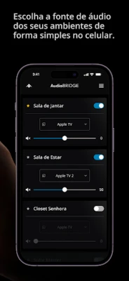 O AudioBRIDGE Control coloca o controle do seu sistema de som ambiente na ponta dos dedos. Com uma conexão contínua e confiável, o AudioBRIDGE App oferece uma maneira simplificada de elevar o desempenho do seu sistema de áudio, permitindo que você selecione fontes, ajuste os níveis de volume, personalize as configurações graves, agudos e muito mais, em uma interface amigável.