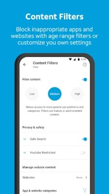 * Parental controls to block apps and website content with age range filters