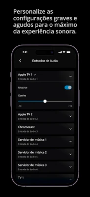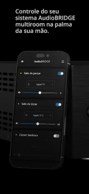 O AudioBRIDGE Control coloca o controle do seu sistema de som ambiente na ponta dos dedos. Com uma conexão contínua e confiável, o AudioBRIDGE App oferece uma maneira simplificada de elevar o desempenho do seu sistema de áudio, permitindo que você selecione fontes, ajuste os níveis de volume, personalize as configurações graves, agudos e muito mais, em uma interface amigável.