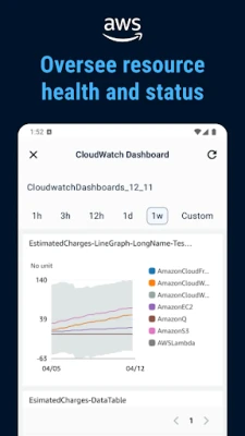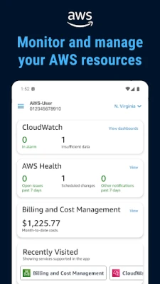 The Console Mobile Application allows you to configure and receive push notifications for AWS services, monitor resources through a dedicated dashboard, and view configuration details, metrics, and alarms for select AWS services. The Dashboard provides permitted users with an overview of the account status, with real-time data on Amazon CloudWatch, AWS Health Dashboard, AWS Billing and Cost Management, and Recently Visited Services. You can view ongoing issues and follow through to the relevant CloudWatch alarm screen for a detailed view with graphs and configuration options. In addition,you can check on the status of specific AWS services, view detailed resource screens, and perform select actions.