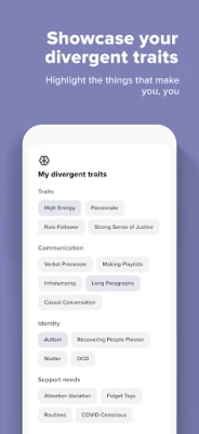 • Profiles that allow you to define your neurodivergent traits, support needs, communication preferences