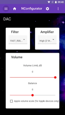 * DAC: Lets you adjust audio output settings, such as filter, amplifier gain, volume limit, and balance.