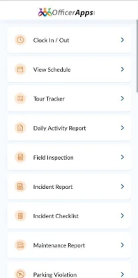 - Guard Tour Tracking system that utilizes NFC Tags or QR Codes. Includes a real-time dashboard that displays guard activity. - Ability to submit Incident Reports, Daily Activity Reports, Field Inspections, Maintenance Requests, Pass On Logs, Parking Violations, Temperature Logs, Truck Logs, and Visitor Logs. - Ability to view the work Schedule, Pass On Logs, Incident Checklists, Post Orders, and Policy Manuals. - Time Clock reporting with the Clock In and Clock Out features.