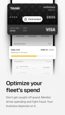 Optimize your fleet's spend - Issue fleet cards that can be accepted anywhere - Set spending limits directly from the app - Get real-time alerts on every transaction